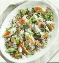 Laat deze alvast schoonmaken door je visboer. Schil de bleekselderij met. Doe de plukjes makreel bij de salade en roer.
